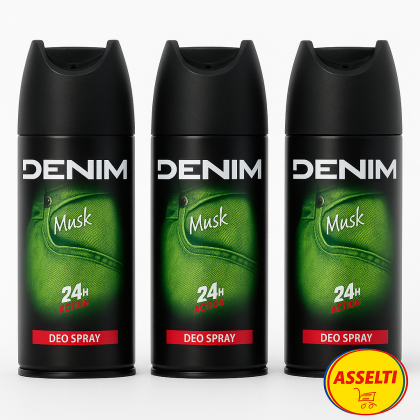 Set ASSELTI® – 3 x Denim Musk Deo Spray 150 ml, deodorant pentru bărbați, 24h acțiune