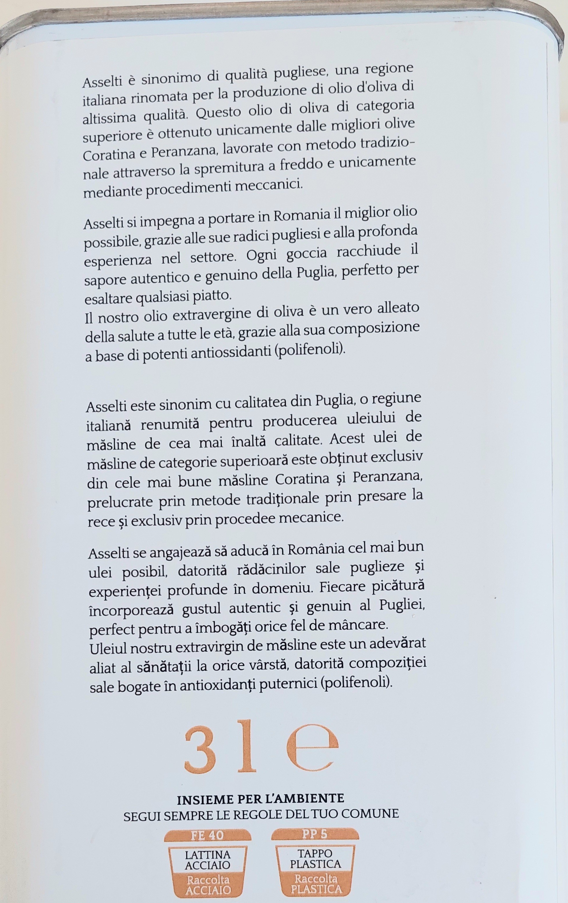 Asselti se angajează să aducă în România cel mai bun ulei posibil, datorită rădăcinilor sale puglieze și experienței profunde în domeniu. Fiecare picătură încorporează gustul autentic și genuin al Pugliei, perfect pentru a îmbogăți orice fel de mâncare.