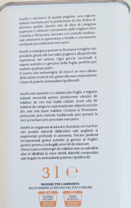Asselti este sinonim cu calitatea din Puglia, o regiune italiană renumită pentru producerea uleiului de măsline de cea mai înaltă calitate. Acest ulei de măsline de categorie superioară este obținut exclusiv din cele mai bune măsline Coratina și Peranzana, prelucrate prin metode tradiționale prin presare la rece și exclusiv prin procedee mecanice.