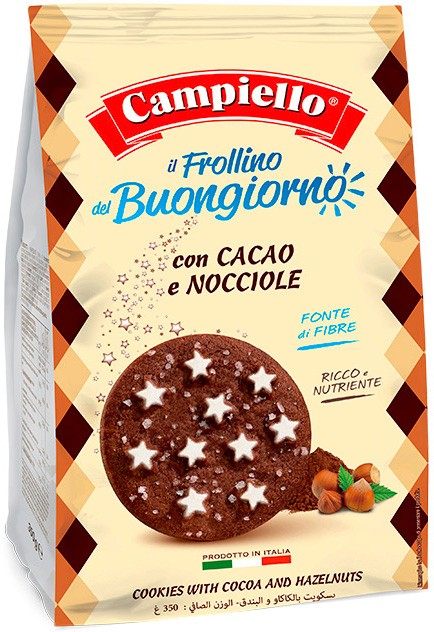 Prajituri Campiello il Buongiorno Frollino con Cacao si Alune sunt prajituri usoare si delicate facute cu ciocolata. O combinație clasică cu cafea sau espresso pentru o gustare de după-amiază sau după cină. Prajiturile Campiello sunt facute din ingrediente simple, fara coloranti sau arome artificiale. De peste patruzeci de ani, Campiello a selectat cu grijă ingrediente naturale și a folosit procese care își mențin misiunea de tradiție și calitate. Pentru un gust autentic, topit în gură, încercați prăjiturile noastre ușoare și delicioase, făcute cu ciocolată adevărată.