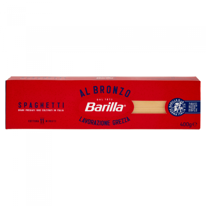 Proprietati: Paste Barilla "Spaghetti Al Bronzo"din grau dur , timp de fierbere: 11 minute, prelucrare bruta.