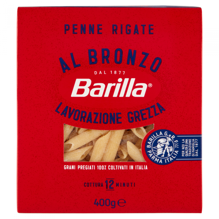 Proprietati: Paste Barilla "Penne Rigate Al Bronzo"din grau dur , timp de fierbere: 12 minute, prelucrare bruta.