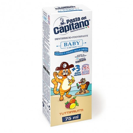 Pasta de dinti cu aroma de tutti-frutti – Pasta del Capitano Baby +3 ani a fost special creata pentru a mentine sanatatea dintilor si a gingiilor in perioada copilariei timpurii. Datorita microgranulelor multicolore si aromei bune de tutti-frutti, incurajeaza copiii sa isi spele dintii. Produsul nu contine parabeni, lauril-sulfat de sodiu (SLS), triclosan si conservanti donori de formaldehida.