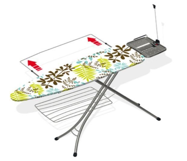Masa de calcat cu blat din plasa metalica cu dimensiunea de 122x38 cm, husa din bumbac, captuseala din burete; suport compact pentru fierul de calcat, cu opritor pentru fixarea in pozitie oblica a fierului, care se poate detasa si monta in functie de pozitia de calcare - dreptaci sau stangaci.
