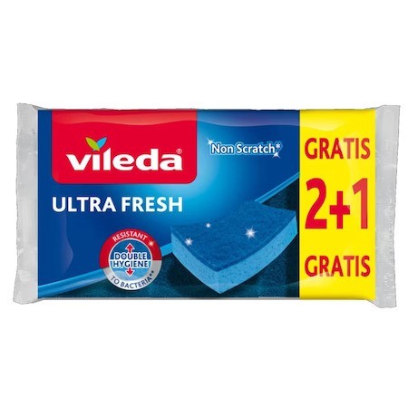 Partea abrazivă albastră conține clorură de argint antibacteriană, iar partea spongioasă albastră hidrofilă conține piritionă de zinc și tiabendazol pentru a inhiba dezvoltarea bacteriilor pe burete. De asemenea, stratul abraziv este mai moale, astfel încât să poată curăța delicat și eficient, fără a zgâria suprafețele. Vileda Ultra Fresh reprezintă soluția perfectă pentru o curățenie sigură și eficientă în bucătărie și în alte zone din gospodărie.