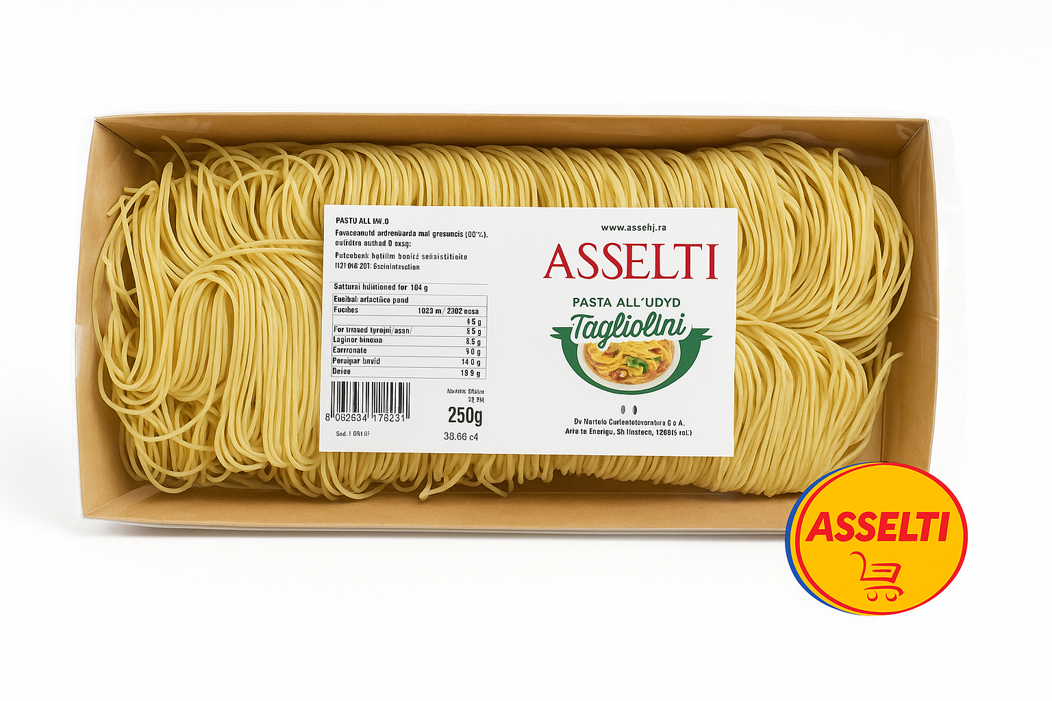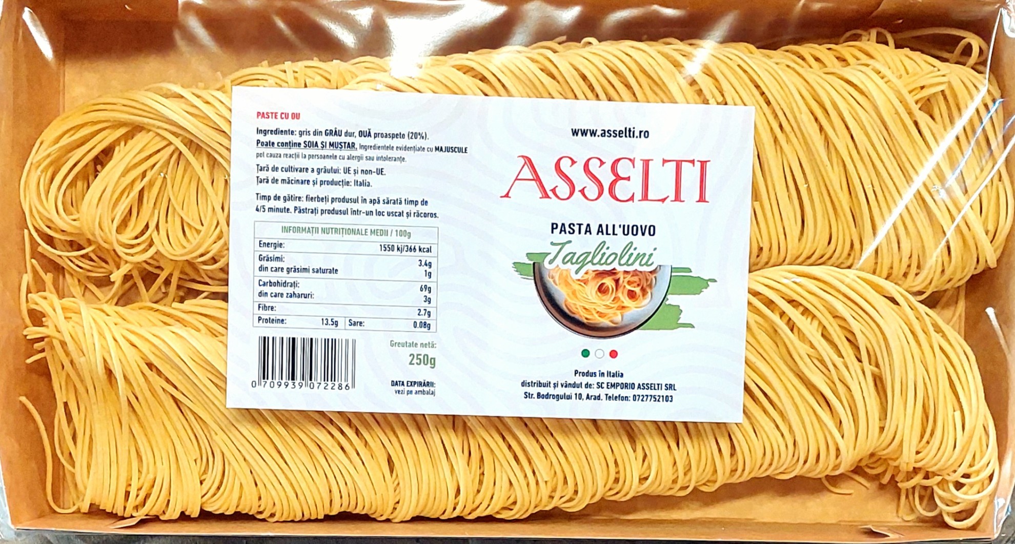 Paste cu ou: Ingrediente: gris din grâu dur, ouă proaspete (20%). Poate conține soia și muștar. Țară de cultivare a grâului: UE și non-UE. Țară de măcinare și producție: Italia. Timp de gătire: fierbeți produsul în apă sărată timp de 5/6 minute. Păstrați produsul într-un loc uscat și răcoros. Informații nutriționale medii per 100gr: energie 1559 kj/366 kcal, grăsimi 3.4gr din care grăsimi saturate 1gr, carbohidrați 69gr din care zaharuri 3gr, fibre 2.7gr, proteine 13.5gr, sare 0.08gr. Produs în Italia și distribuit și vândut de SC Emporio Asselti srl, Str. Bodrogului 10, Arad. www.asselti.ro. Telefon: 0727752103