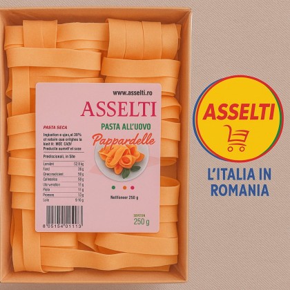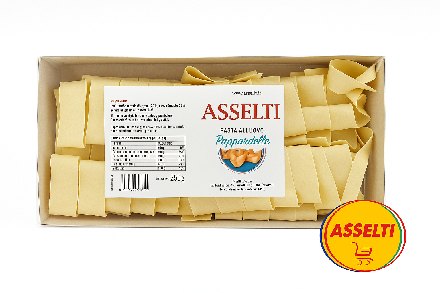 Paste cu ou: Ingrediente: gris din grâu dur, ouă proaspete (20%). Poate conține soia și muștar. Țară de cultivare a grâului: UE și non-UE. Țară de măcinare și producție: Italia. Timp de gătire: fierbeți produsul în apă sărată timp de 5/6 minute. Păstrați produsul într-un loc uscat și răcoros. Informații nutriționale medii per 100gr: energie 1559 kj/366 kcal, grăsimi 3.4gr din care grăsimi saturate 1gr, carbohidrați 69gr din care zaharuri 3gr, fibre 2.7gr, proteine 13.5gr, sare 0.08gr. Produs în Italia și distribuit și vândut de SC Emporio Asselti srl, Str. Bodrogului 10, Arad. www.asselti.ro. Telefon: 0727752103