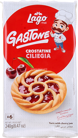 Mini Tarte Cu Cirese Lago. Tartine cu gem (28%) de cirese. Ingrediente: faina din GRAU, gem de cirese ( sirop de glucoza-fructoza, piure de cirese 35%, zahar, gelifiant; pectina, colorant: cosenila, arome), zahar, margarina vegetala (ulei de cocos, ulei de floarea soarelui), UNT, OUA, agenti de afanare: carbonat acid de sodiu, difosfat disodic, carbonat acid de amoniu, LAPTE praf degresat, sare, arome, dextroza. Poate contine urme de ARAHIDE, FRUCTE CU COAJA si SOIA. Gramaj: 6x40g