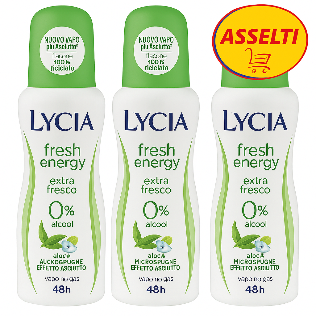 Descoperă prospețimea intensă cu deodorantul fără gaz LYCIA Fresh Energy. Formulat cu aloe vera și bergamotă, oferă o senzație revigorantă de durată, ideală pentru zilele active. Tehnologia cu microspugne absoarbe eficient transpirația, menținând pielea uscată până la 48 de ore. Formula este fără alcool, potrivită și pentru pielea sensibilă, iar flaconul este fabricat din material 100% reciclat. Cu un nou sistem de vaporizare mai uscată (nuovo vapo più asciutto), aplicarea este confortabilă și fără reziduuri.