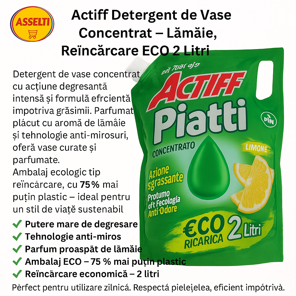 Actiff Detergent de Vase Concentrat – Lămâie, Reîncărcare ECO 2 Litri