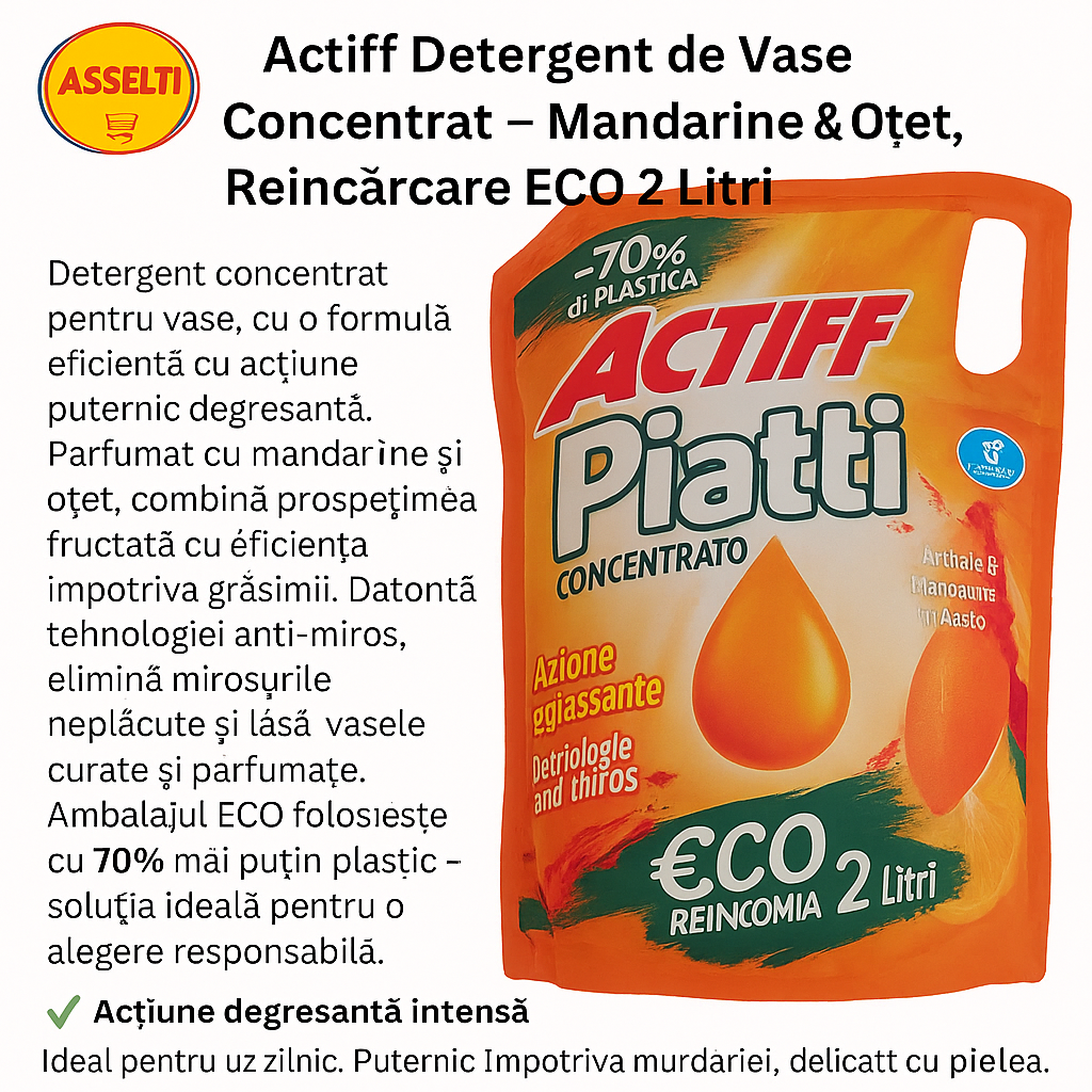 Actiff Detergent de Vase Concentrat – Mandarine & Oțet, Reîncărcare ECO 2 Litri