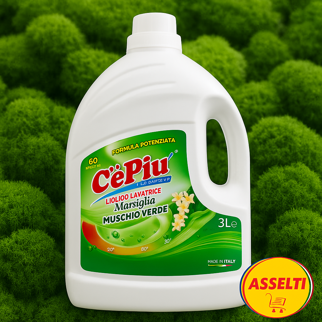 Detergentul lichid pentru rufe C’è Piu Marsiglia & Muschio Verde îmbină eficiența spălării cu parfumul clasic de săpun de Marsilia și prospețimea inconfundabilă a mușchiului verde. Formula sa potențată curăță rufele în profunzime chiar și la temperaturi joase.
