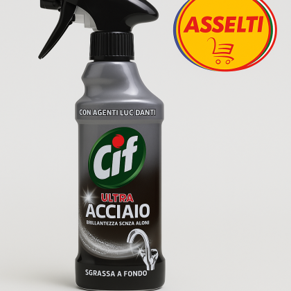Cif Ultra Acciaio este un detergent spray special conceput pentru curățarea și lustruirea suprafețelor din inox (chiuvete, robinete, hote, cuptoare etc.). Formula sa cu agenți lucidanți elimină eficient grăsimea și murdăria, oferind în același timp un finisaj impecabil, fără urme.