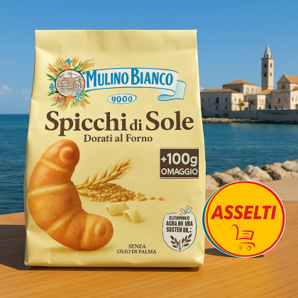 Bucură-te de gustul autentic italian cu Spicchi di Sole Mulino Bianco, cornuri moi și aurii, coapte la cuptor, perfecte pentru mic dejun sau gustări delicioase. Pregătite cu făină din agricultură sustenabilă și fără ulei de palmier.