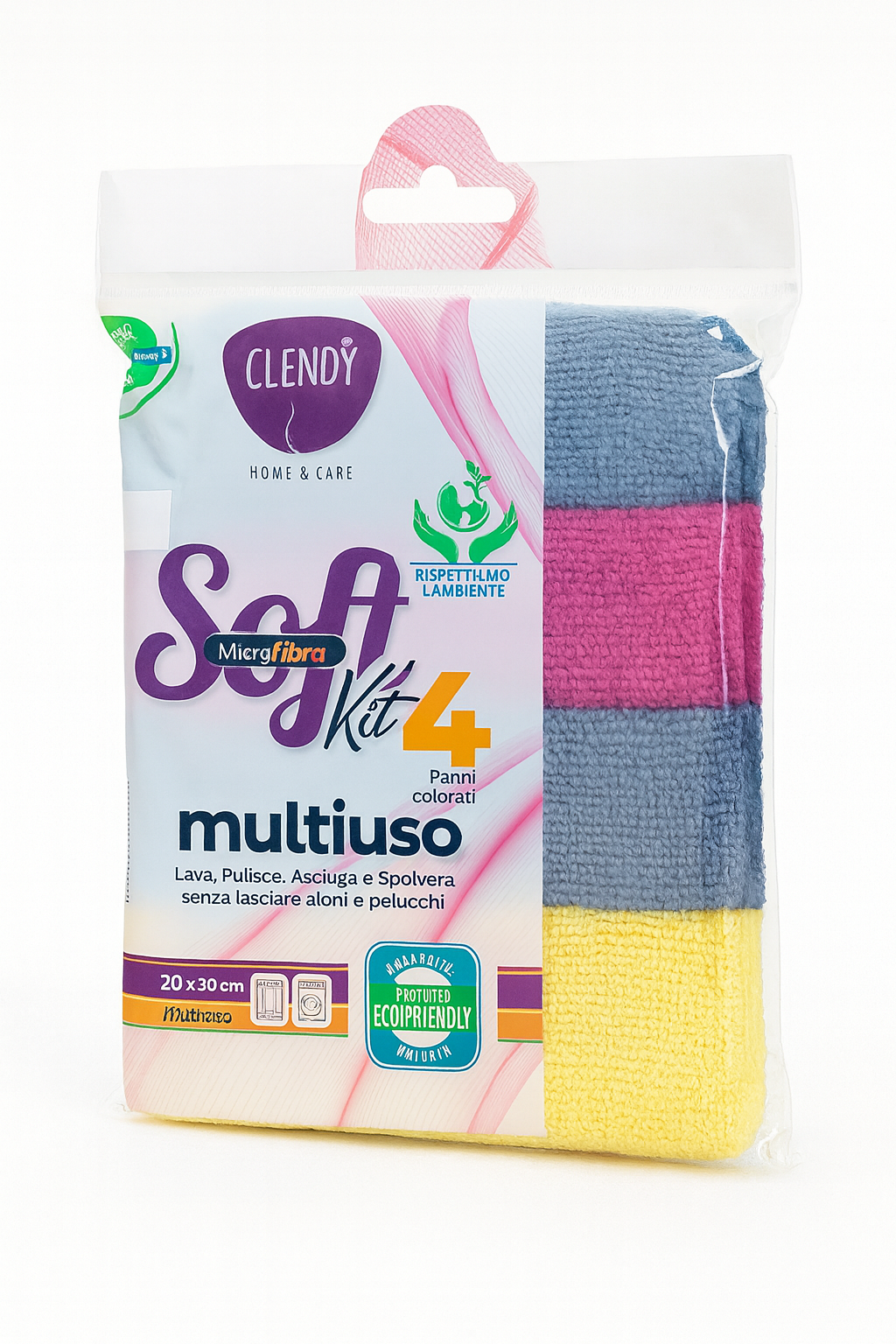 Setul Clendy Soft Microfibra Kit 4 conține lavete colorate din microfibră moale, perfecte pentru curățarea, uscarea și ștergerea tuturor suprafețelor din casă. Datorită materialului de înaltă calitate, lavetele curăță eficient murdăria, grăsimea și praful, fără a lăsa urme sau scame.