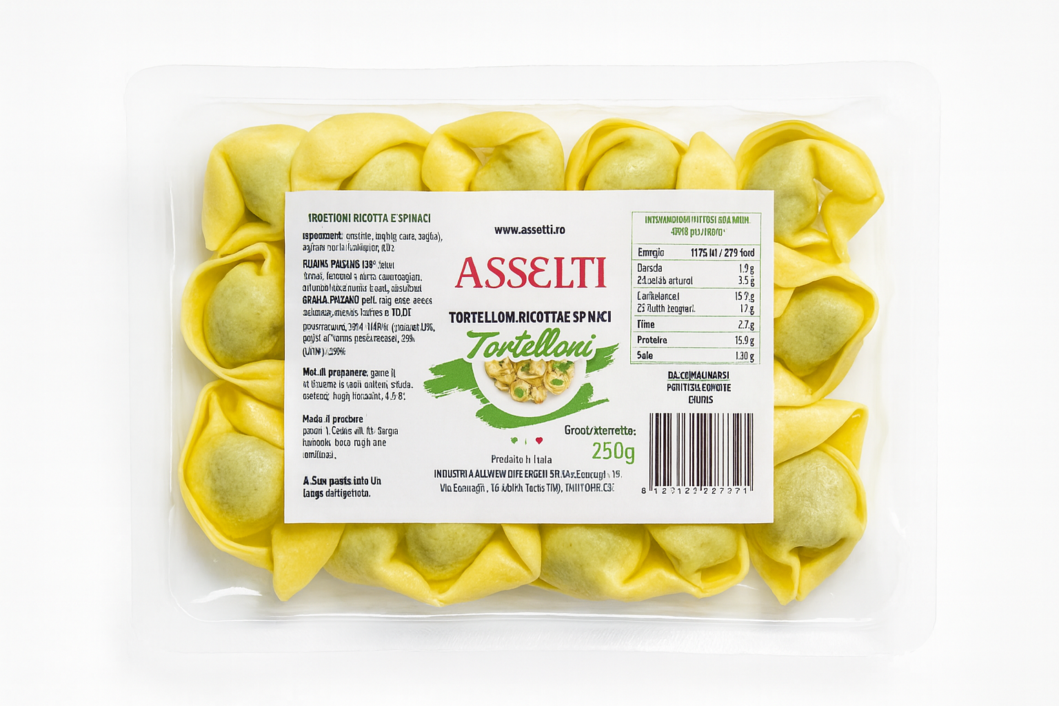 Bucură-te de gustul autentic al pastelor italiene cu Tortelloni Asselti umpluți cu ricotta fină și spanac proaspăt. Produși în Italia după rețete tradiționale, acești tortelloni se remarcă prin textura lor delicată, culoarea aurie apetisantă și umplutura cremoasă, perfect echilibrată.