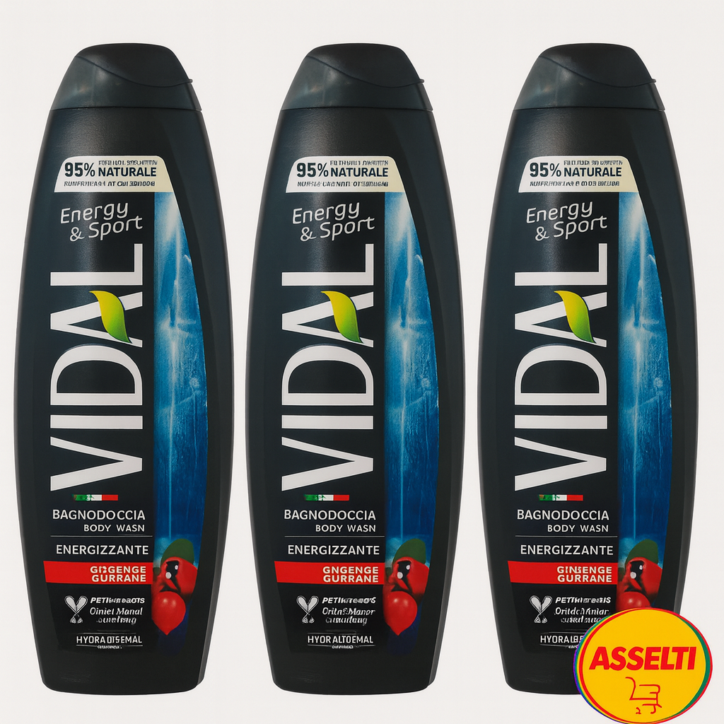 Set ASSELTI® Origine Italia – 3 x Vidal Energy & Sport 500 ml, Gel de duș energizant cu Ginseng și Guaranà