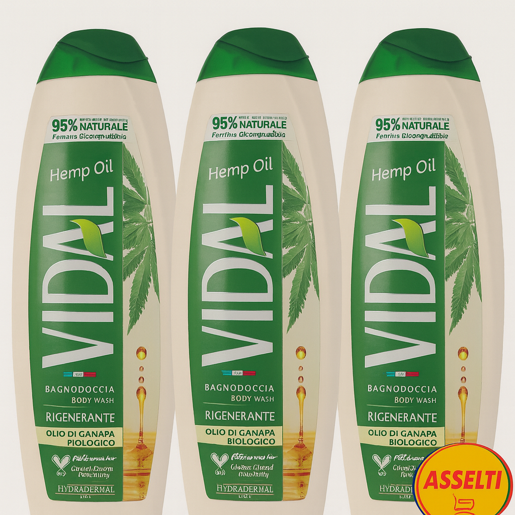 Set ASSELTI® Origine Italia – 3 x Vidal Hemp Oil 500 ml, gel de duș regenerant cu ulei de cânepă bio