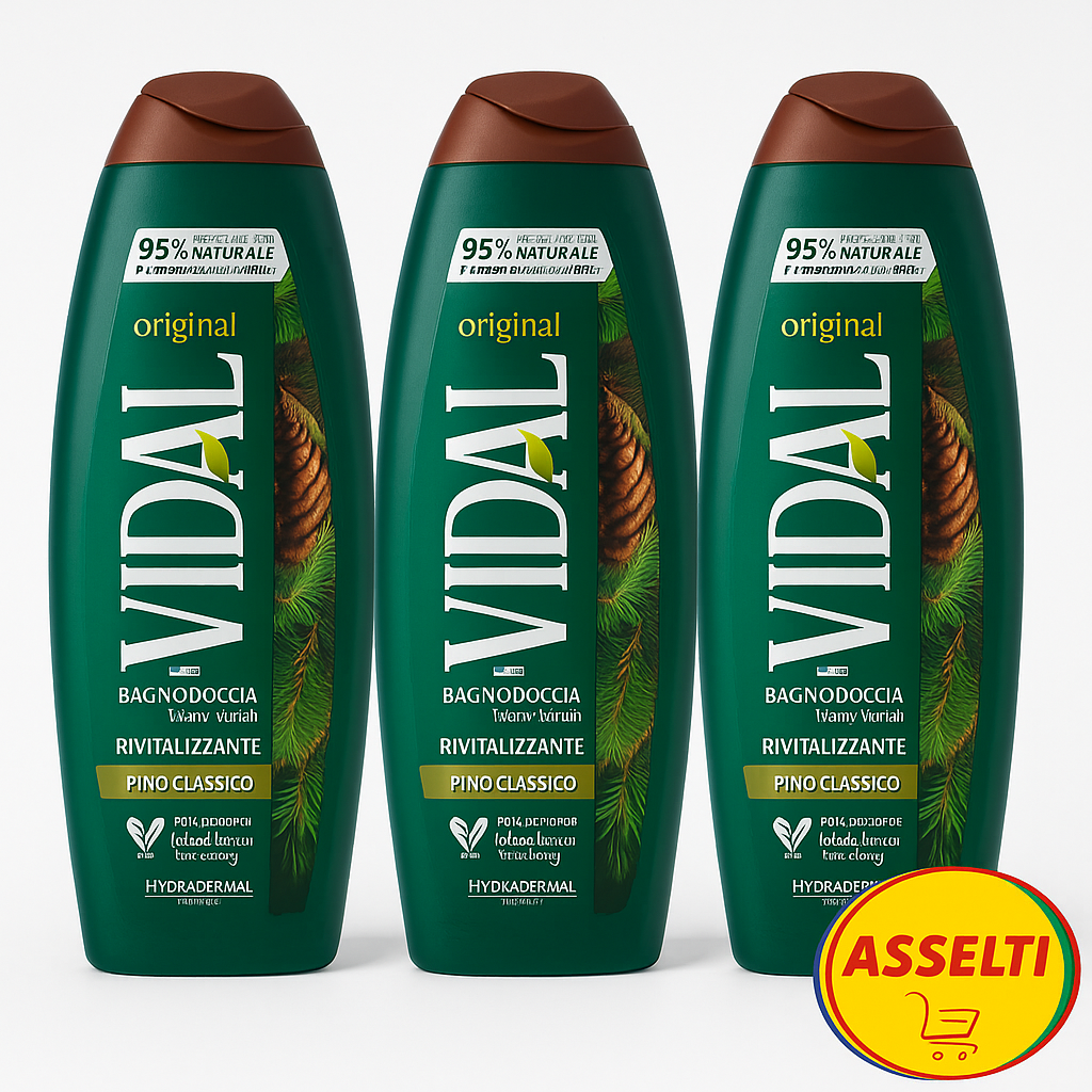 Set ASSELTI® Origine Italia – 3 x Vidal Pino Classico 500 ml, gel de duș revitalizant cu extract de pin