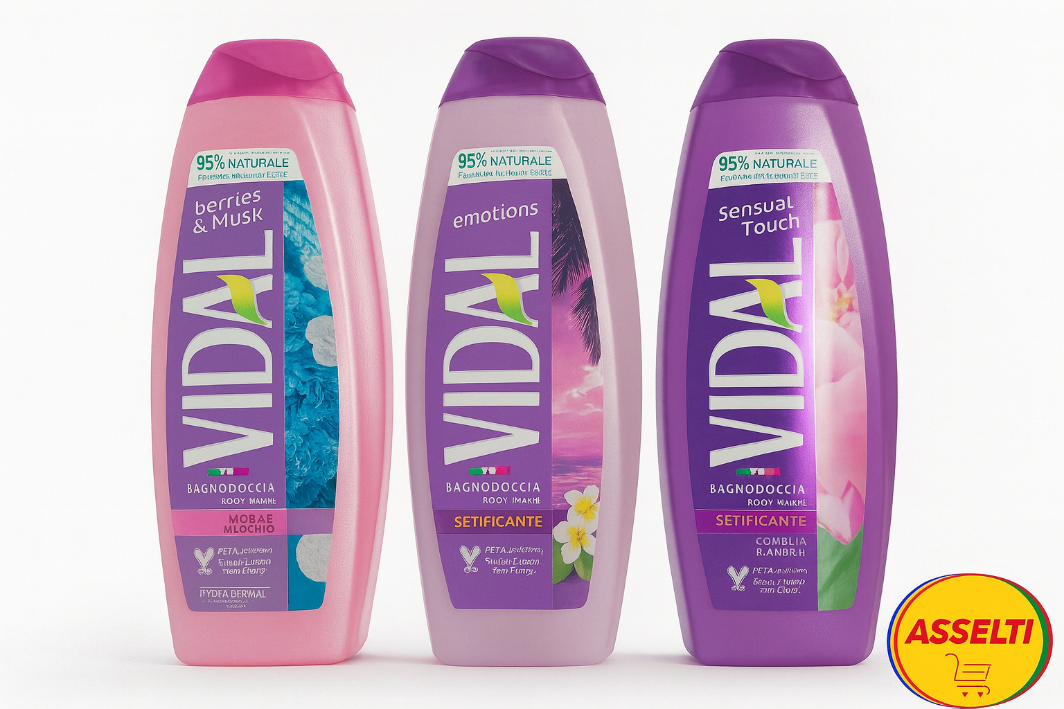 Gramaj produs: Set ASSELTI® – 3 x Vidal Pink & Purple Gel de Duș 500 ml