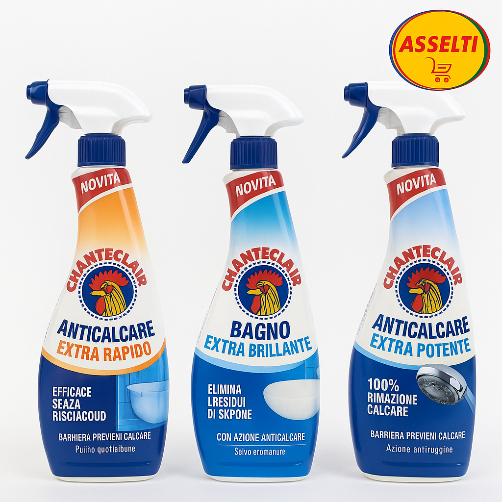 Setul ASSELTI® “Curățenie Profesională Baie & Anticalcar” include trei produse Chanteclair originale din Italia, ideale pentru îndepărtarea rapidă a calcarului, a reziduurilor de săpun și pentru menținerea strălucirii suprafețelor din baie. Formulele lor puternice acționează eficient chiar și pe murdăria persistentă, lăsând suprafețele curate și protejate datorită barierei anti-calcar.
