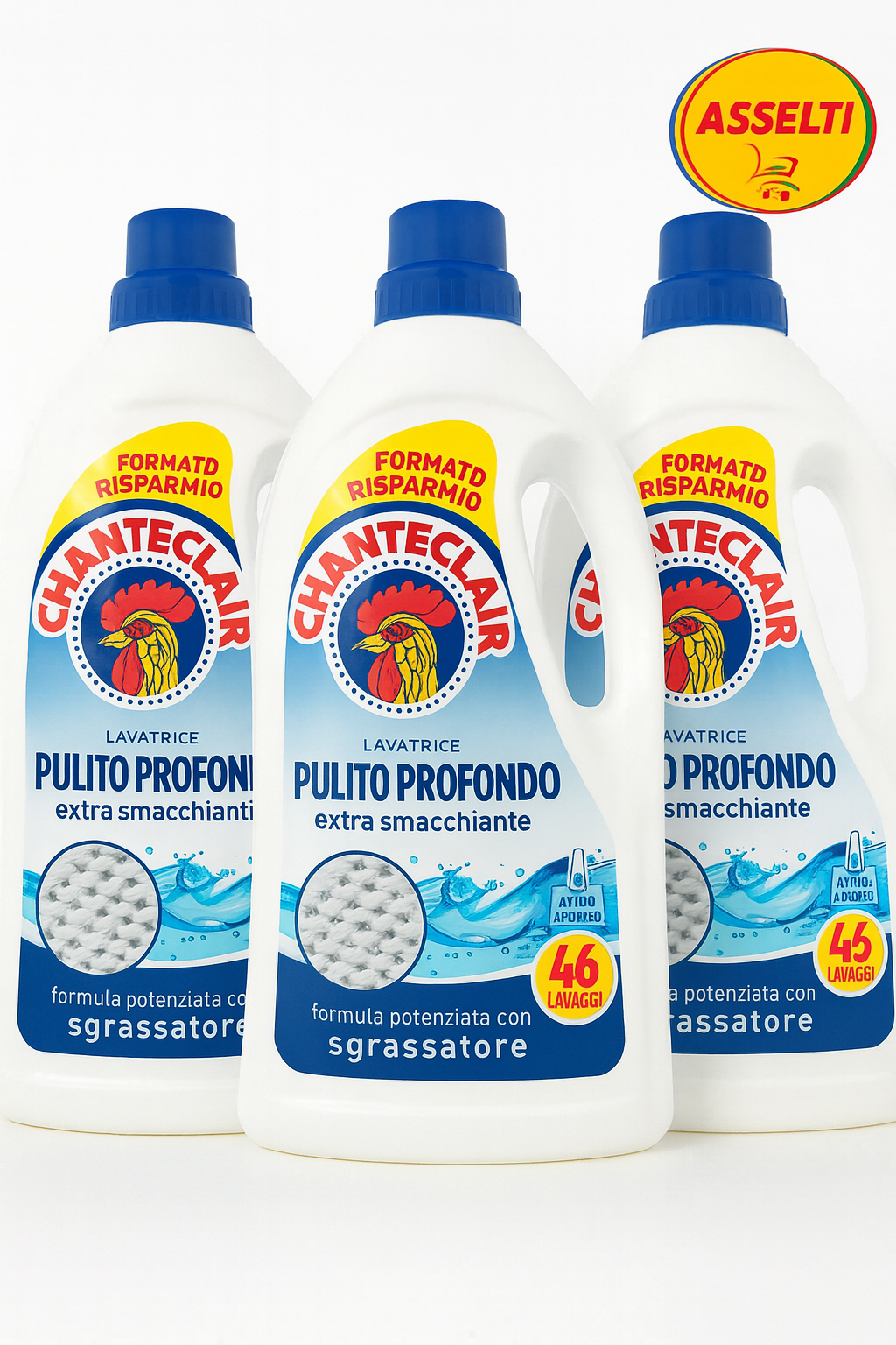 Acest set ASSELTI® reunește 3 sticle de Chanteclair Pulito Profondo 46 lavaggi, detergent celebru pentru puterea sa de îndepărtare a petelor dificile.