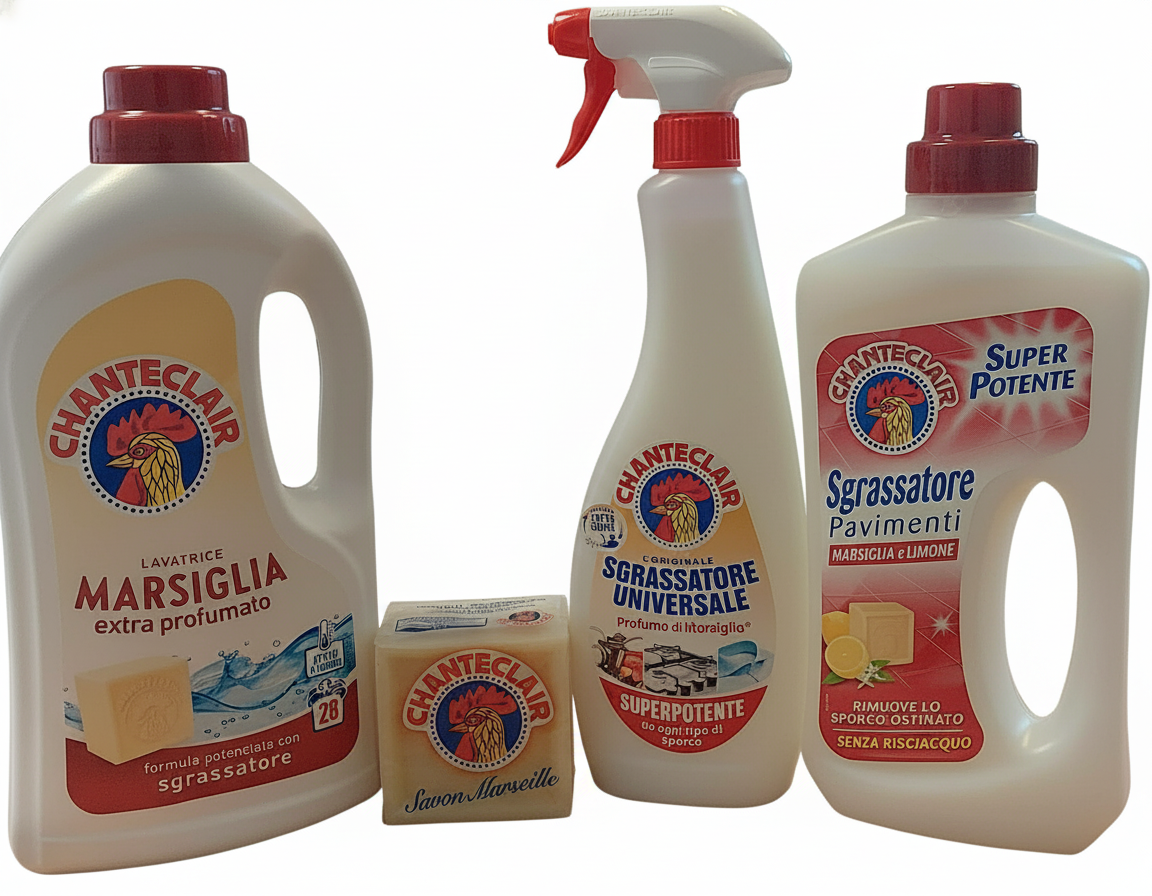 Acest set complet Chanteclair, importat din Italia, oferă soluții profesionale pentru curățenia întregii case. Produsele combină puterea celebrului degresant italian cu parfumul clasic de Marsiglia și prospețimea lămâii, fiind ideale pentru rufe, suprafețe și podele.