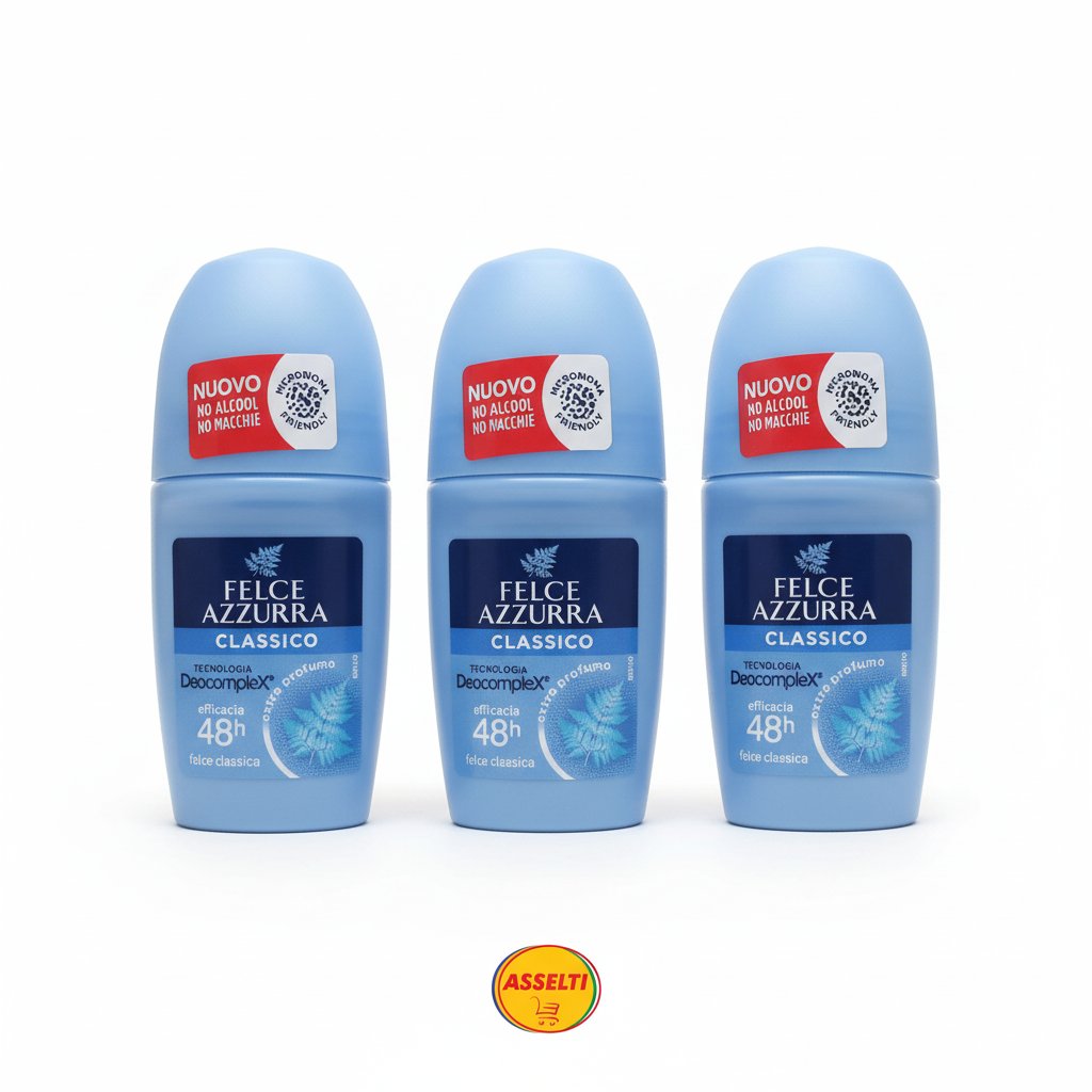 Set ASSELTI® Origine Italia – 3 x Felce Azzurra Deodorant Roll-On Classico 50 ml, protecție 48h și parfum italian delicat