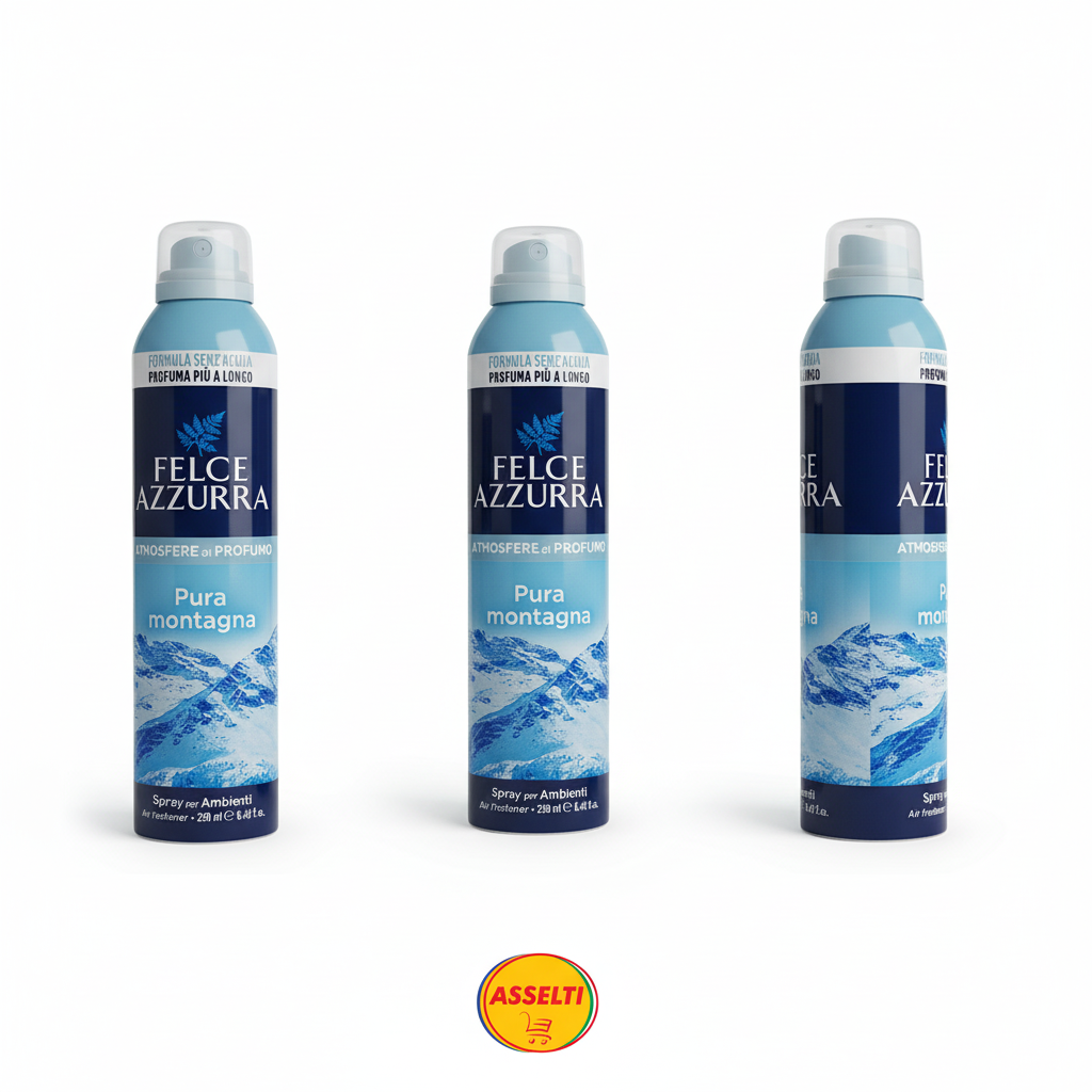 Set ASSELTI® Origine Italia – 3 x Felce Azzurra Spray Ambienti Pura Montagna 250 ml, odorizant cu parfum proaspăt de munte