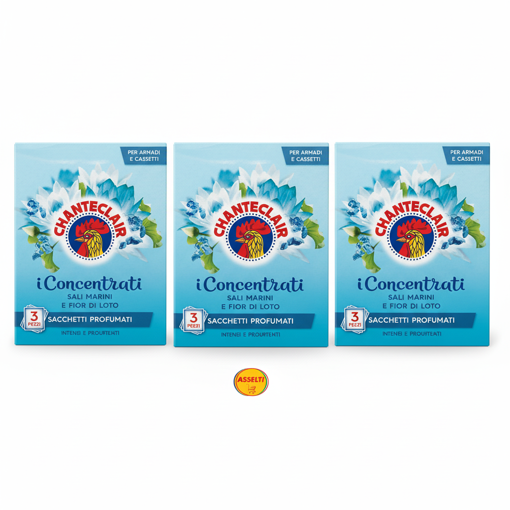 Setul conține 3 pachete Chanteclair I Concentrati, fiecare cu 3 săculeți parfumați, creați pentru a oferi o aromă intensă și persistentă în dulapuri, sertare, dressing-uri sau spații mici închise.
