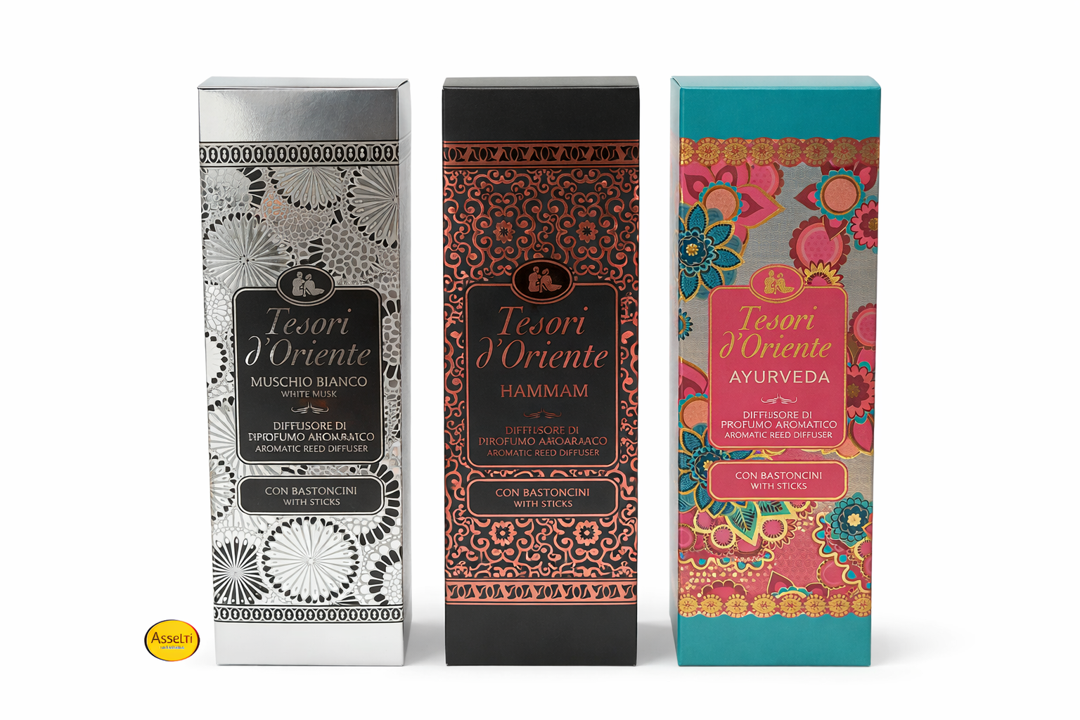 Set Tesori d’Oriente® Difuzoare Parfum Ambient – 3 Arome: Muschio Bianco, Hammam, Ayurveda, cu Bețișoare,200ml