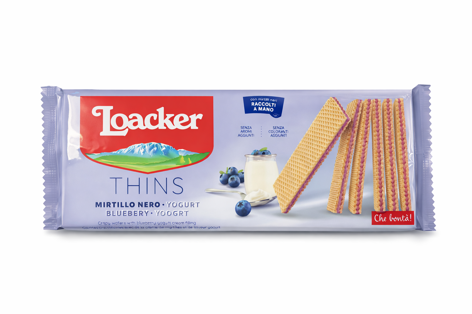 Loacker Thins Afine & Iaurt – Napolitane crocante cu cremă de afine și iaurt, 150 g