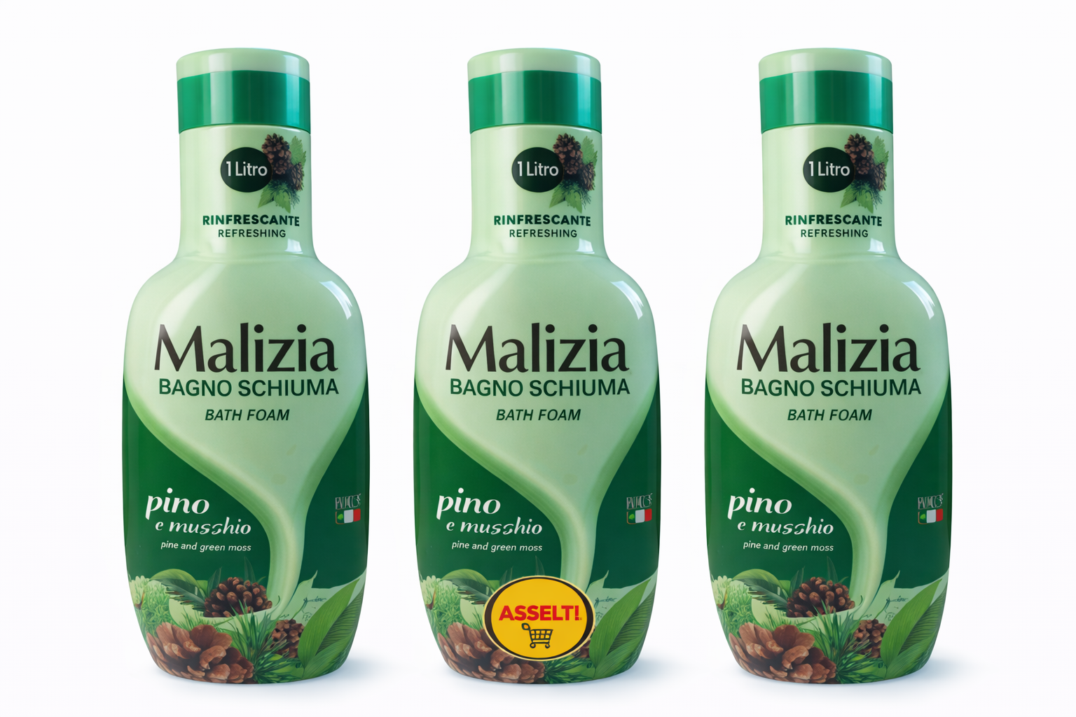 Setul ASSELTI® Origine Italia conține 3 flacoane x 1 litru de Malizia Bagno Schiuma Pin și Mușchi, gel de baie italian cu efect revigorant și răcoritor, ideal pentru o senzație de prospețime intensă la fiecare utilizare.