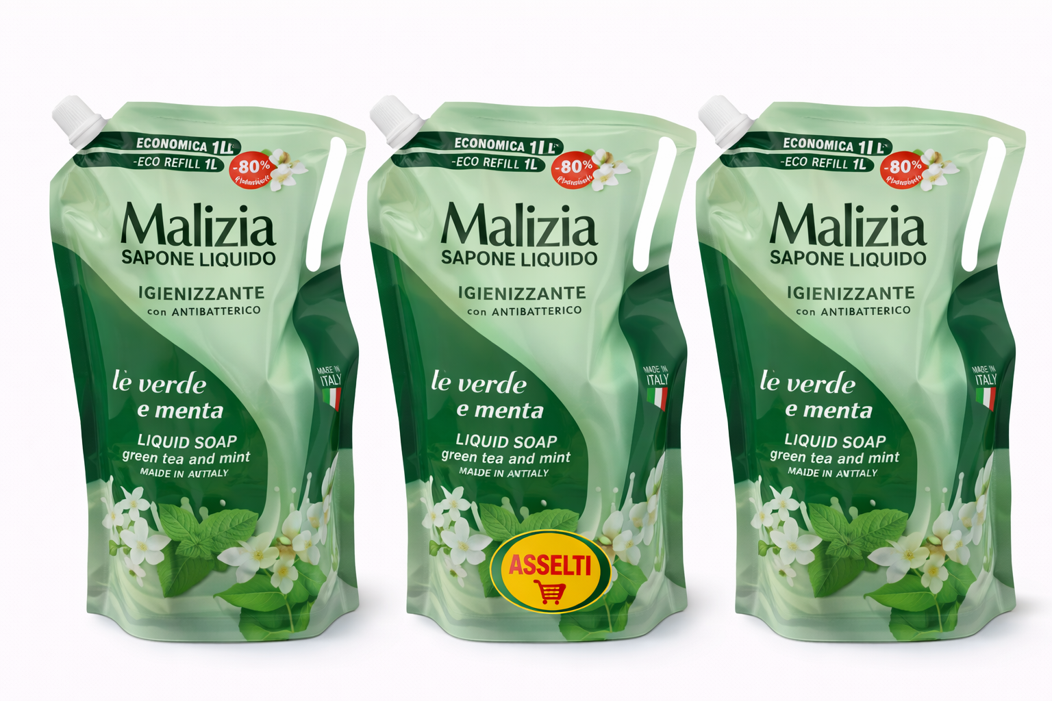 Set 3 buc Malizia Săpun Lichid Ceai Verde & Mentă – Rezervă 1 L, antibacterian