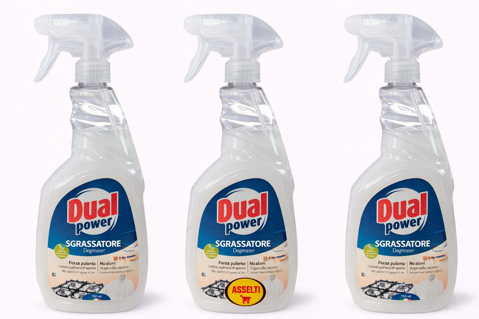 Setul conține 3 spray-uri Dual Power Degresant Universal cu parfum de Marsiglia, fiecare de 750 ml, ideal pentru îndepărtarea eficientă a grăsimii și murdăriei persistente din bucătărie și din întreaga casă.