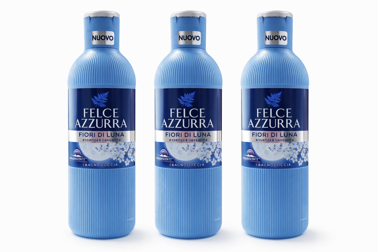 Setul conține 3 flacoane identice de Felce Azzurra Fiori di Luna, gel de duș și baie, cu o formulă delicată și o esență relaxantă, ideală pentru momentele de răsfăț zilnic.