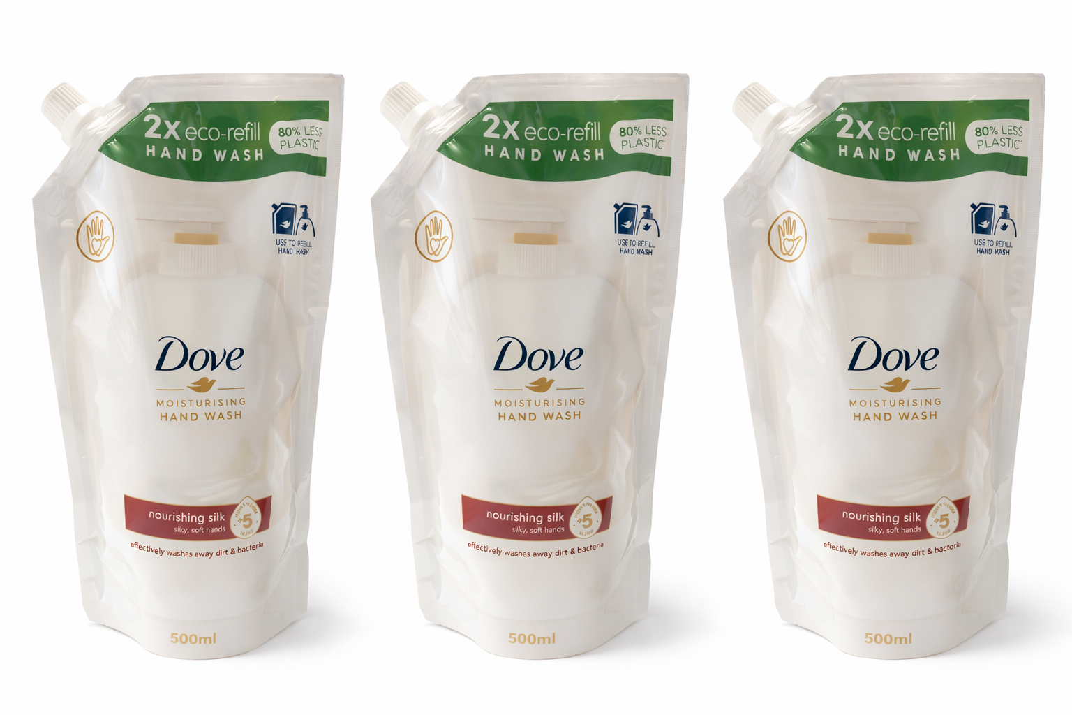 Setul conține 3 rezerve eco-refill Dove Moisturising Hand Wash de 500 ml, ideale pentru utilizare zilnică și pentru reducerea consumului de plastic.