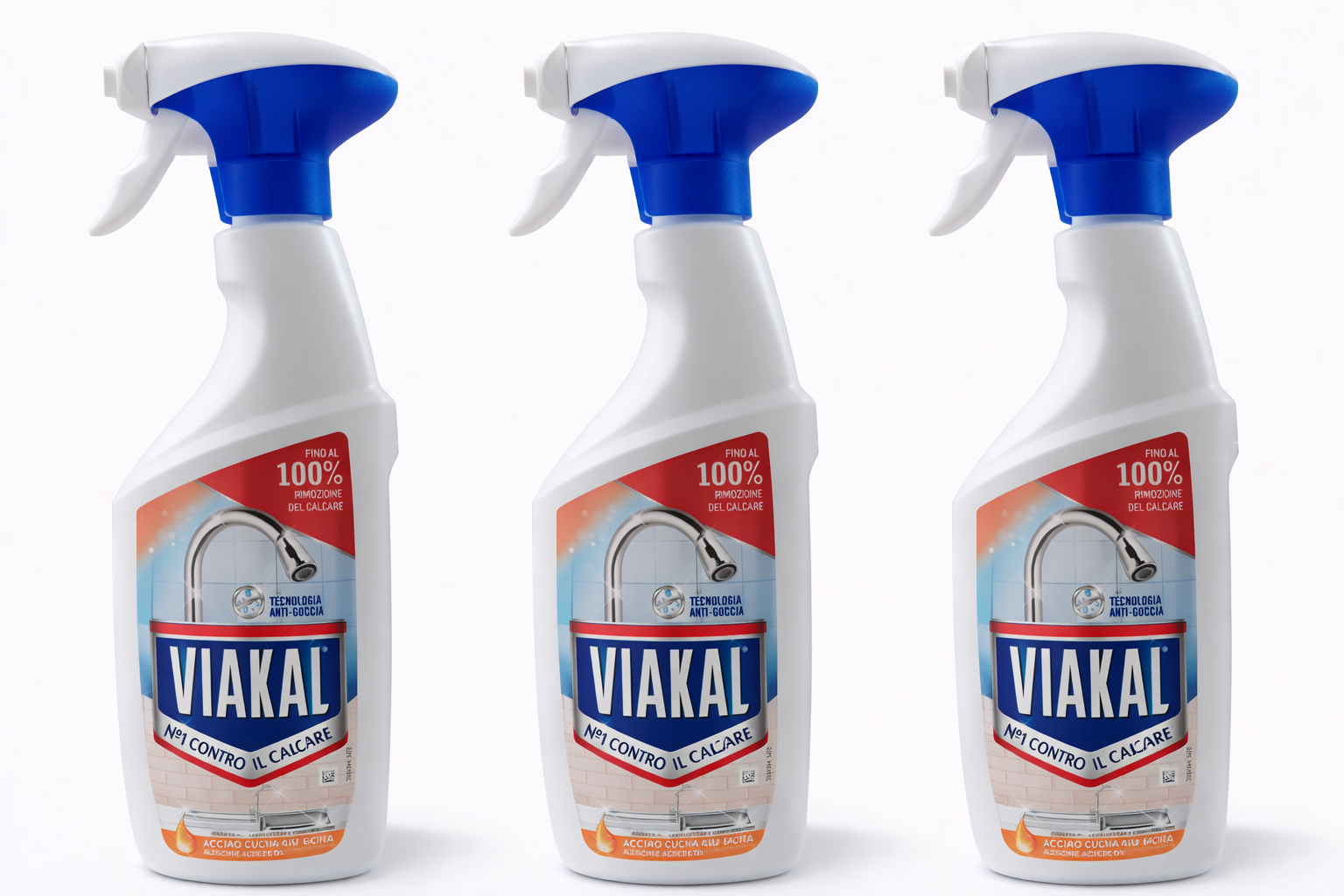 Setul conține 3 flacoane Viakal soluție anticalcar spray, 470 ml fiecare, cu acțiune pe bază de oțet, special concepută pentru îndepărtarea eficientă a calcarului și neutralizarea mirosurilor neplăcute din baie și bucătărie.