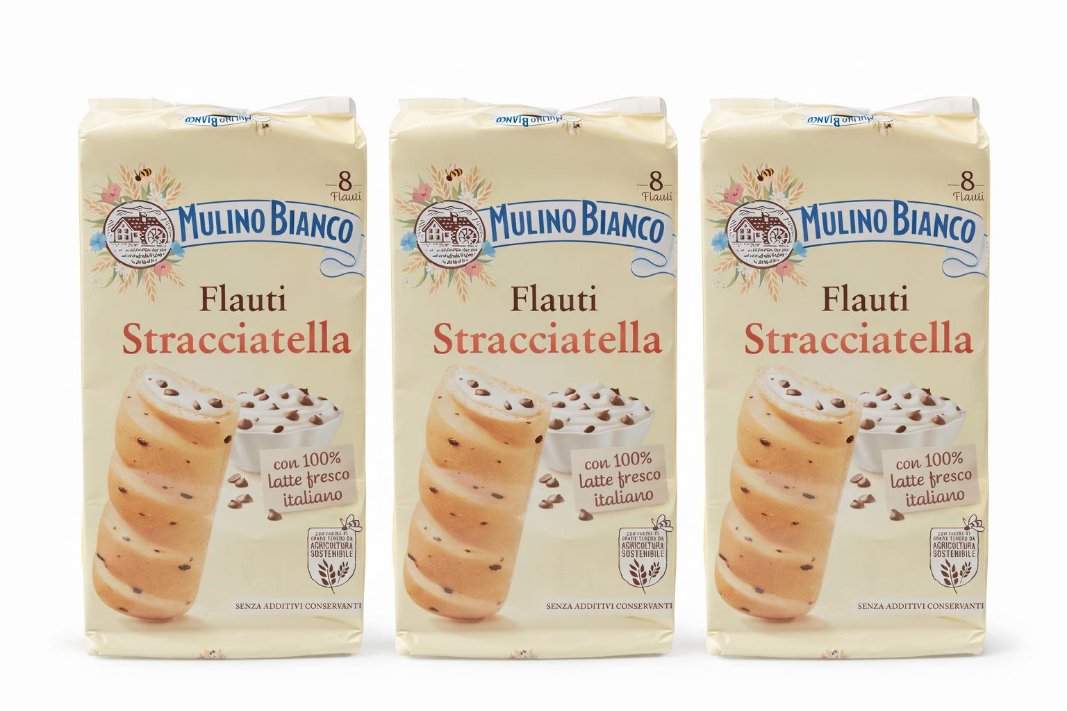 Setul Mulino Bianco Flauti Stracciatella – 3 bucăți x 280 g este alegerea ideală pentru cei care iubesc gustările dulci, pufoase și cremoase, perfecte pentru micul dejun sau pauzele de peste zi.