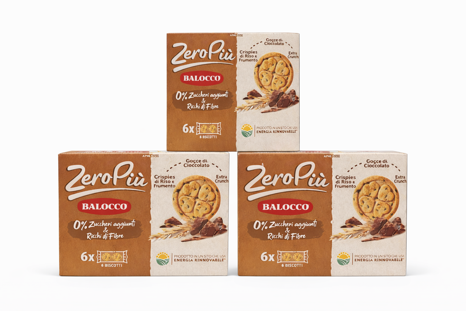 Setul conține 3 cutii identice de biscuiți Balocco ZeroPiù, concepuți pentru cei care își doresc o gustare echilibrată, fără zahăr adăugat. Biscuiții sunt extra crocanți, cu picături de ciocolată și crispies din orez și grâu, oferind un gust plăcut și o textură intensă.