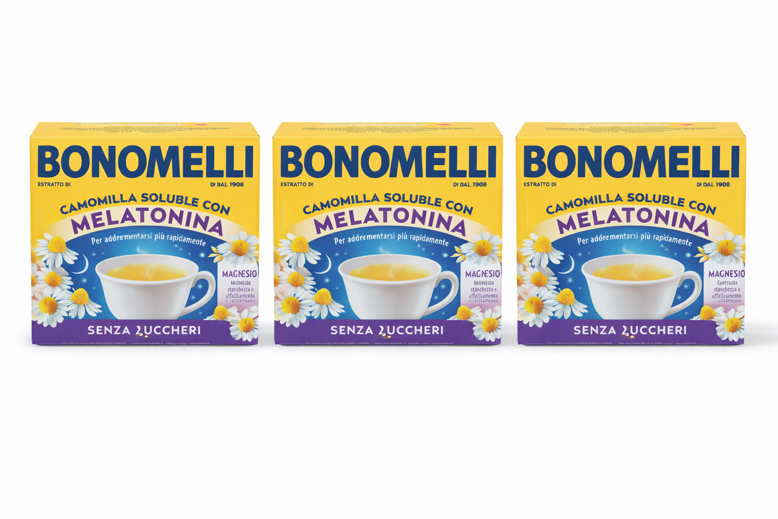 Bonomelli Camomilla Solubilă cu Melatonină – set 3 x72 g, 16 Pliculețe, Fără Zahăr, cu Magneziu