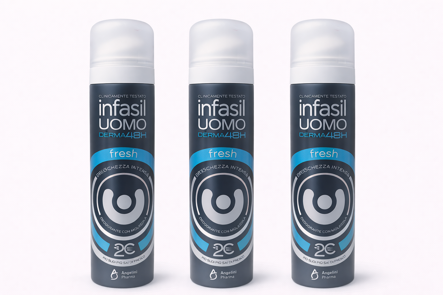 Setul Infasil Uomo Derma 48H Fresh conține 3 spray-uri deodorante a câte 150 ml fiecare, concepute special pentru bărbați activi care doresc protecție de lungă durată și prospețime intensă.