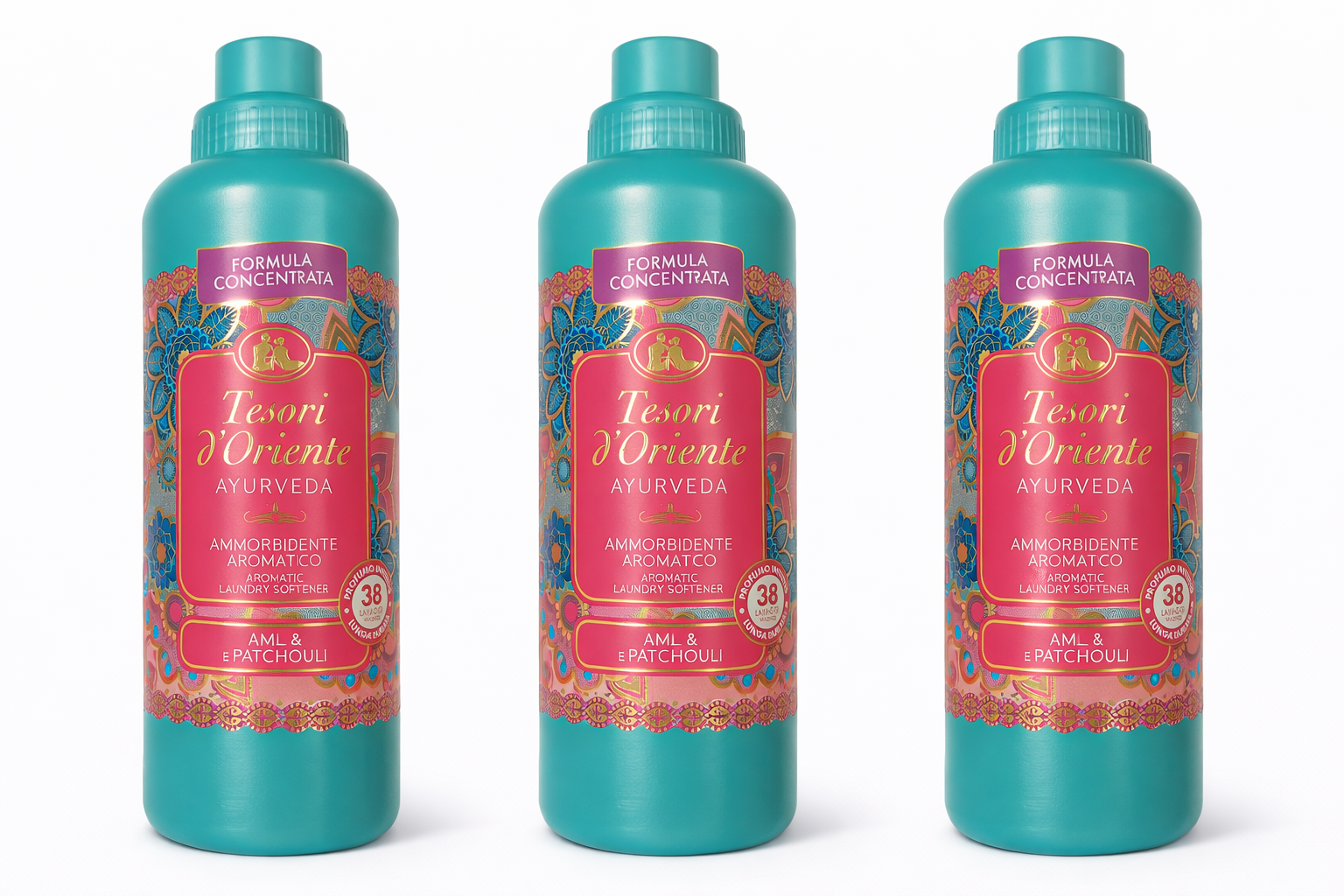 Setul conține 3 balsamuri de rufe Tesori d’Oriente Ayurveda Amla & Patchouli, fiecare cu 760 ml, cu formulă concentrată, creată pentru a oferi rufelor catifelare intensă și un parfum oriental rafinat, de lungă durată.