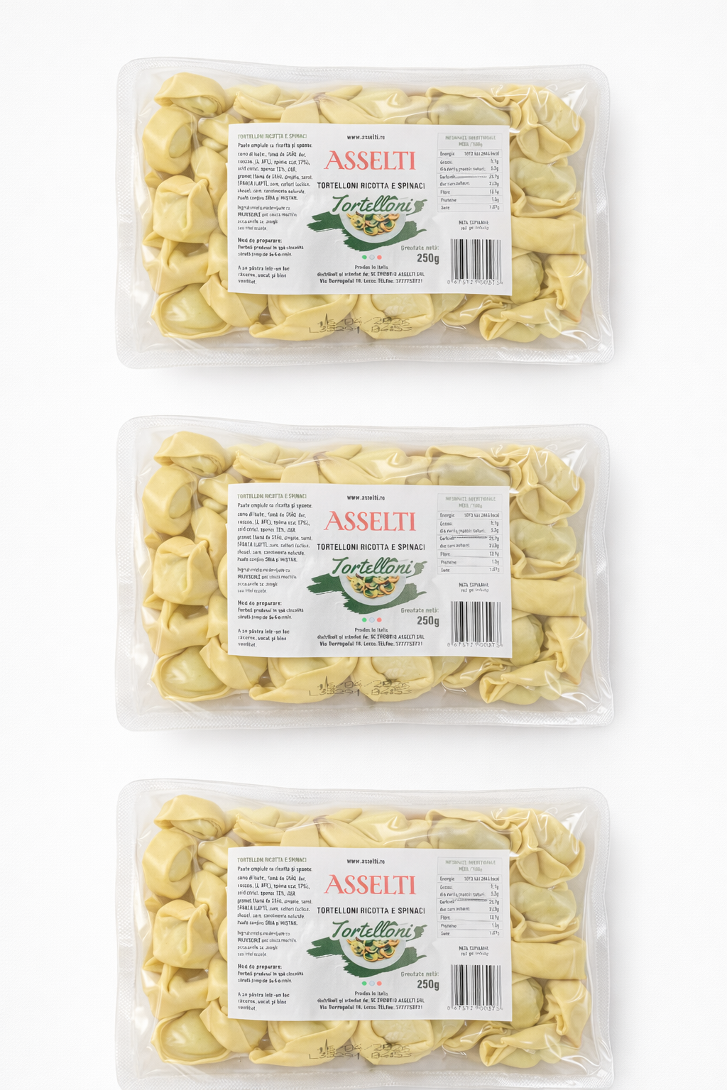 Gramaj produs: Set 3 x Tortelloni ASSELTI cu Ricotta și Spanac, 250 g – Paste proaspete umplute, Produs în Italia