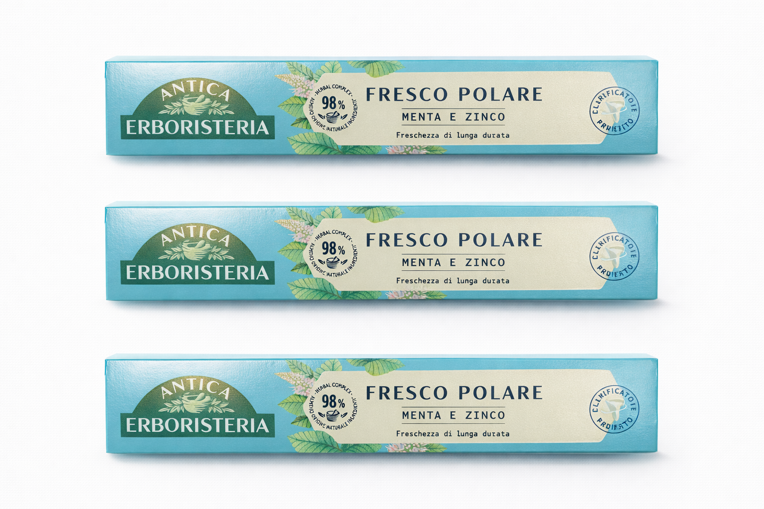 Setul conține 3 paste de dinți Antica Erboristeria Fresco Polare – Mentă și Zinc, fiecare cu un volum de 75 ml, ideal pentru utilizare zilnică.