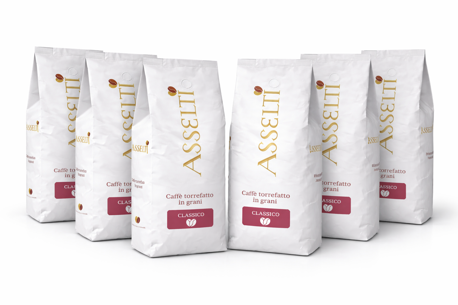 Setul ASSELTI Classico include 6 pachete de cafea boabe a câte 1 kg, realizate dintr-un amestec echilibrat de Arabica și Robusta, creat pentru iubitorii gustului clasic de cafea italiană.