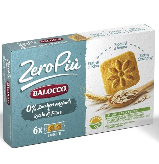 Biscuiti Balocco Zero Piu' Fara Zahar. Ingrediente: faina din GRAU 52%, indulcitor ( maltitol, sirop de maltitol), ulei de floarea soarelui, cereale crocante 8% ( faina din orez 60%, faina din GRAU 40%), OUA, faina din orez 3.2%, faina din fulgi de OVAZ 3.2%, etract de malt de ORZ 1.6%, fibre din GRAU 1.6%, agenti de afanare: carbonat de amoniu, carbonat de sodiu, arome, sare, proteine din LAPTE. Poate contine FRUCTE IN COAJA, MUSTAR SI SOIA. Gramaj: 230g
