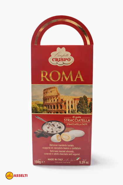 Confetti Crispo Roma Stracciatella – Migdale prăjite în ciocolată albă cu fulgi de cacao, 150 g, Made in Italy