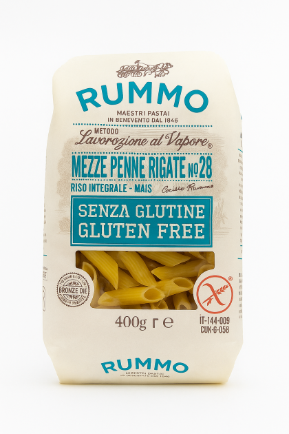 Rummo Mezze Penne Rigate Nr. 28 – Fără gluten, din orez integral și porumb, 400 g
