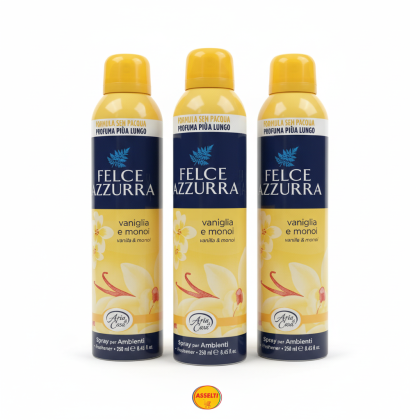 Set ASSELTI® Origine Italia – 3 x Felce Azzurra Spray Ambienti Vaniglia e Monoi 250 ml, odorizant cu parfum dulce și exotic